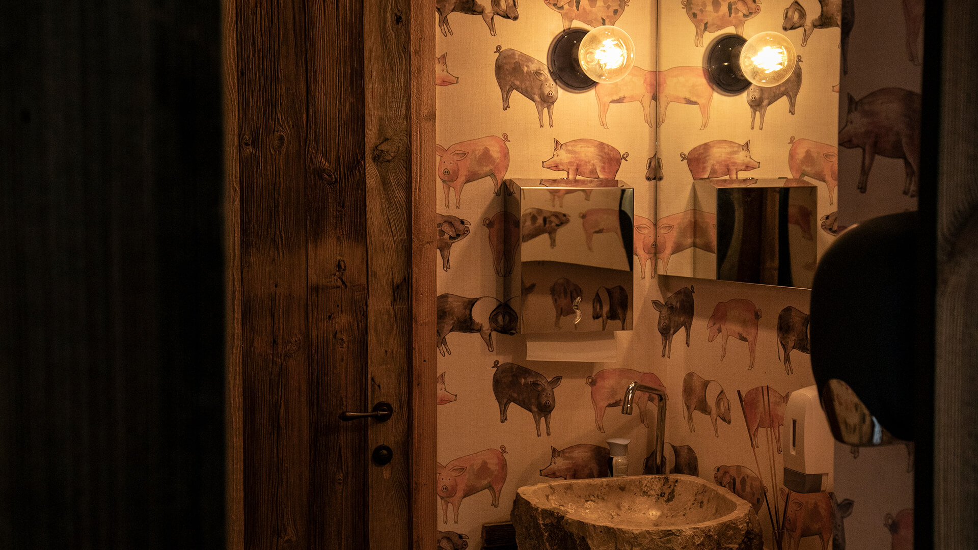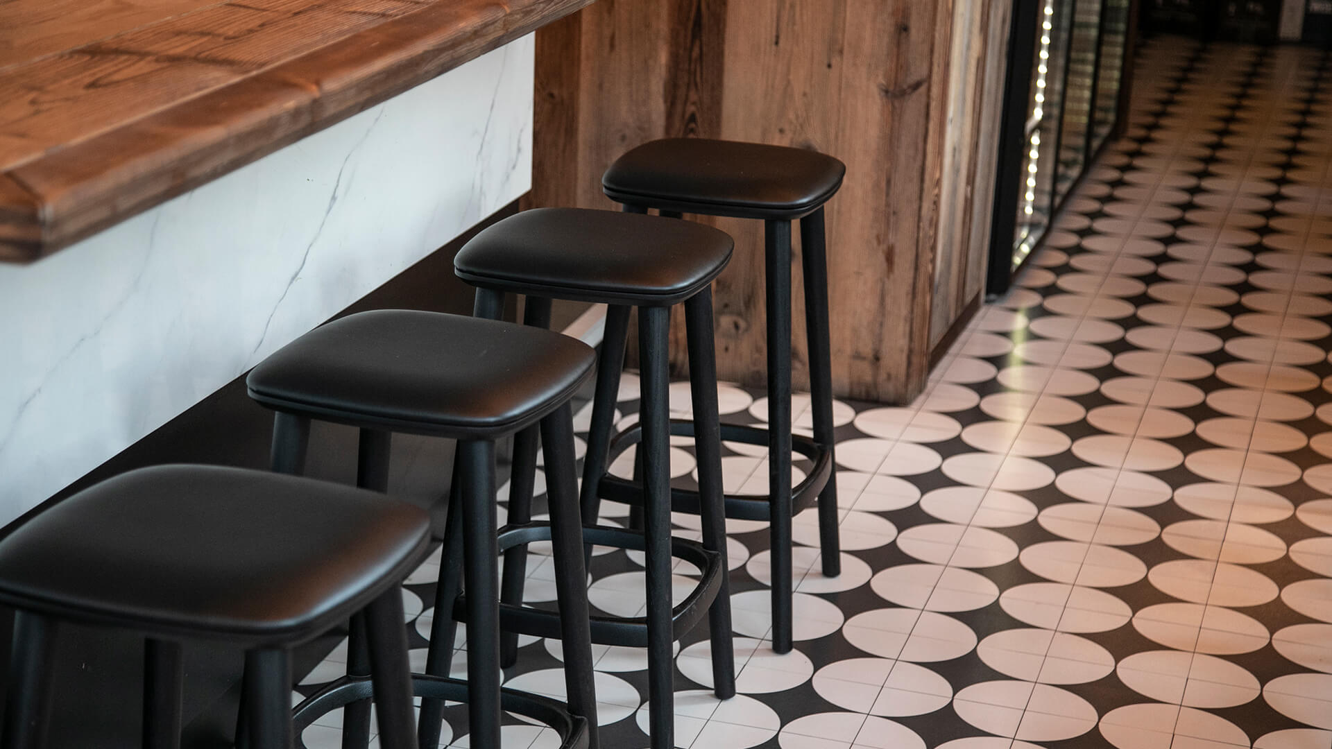 Al piano terra, il bancone in marmo e legno funge da punto focale, invitando gli avventori a gustare un aperitivo o un pasto veloce. Il pavimento piastrellato lucido dona un tocco di luminosità all’ambiente, mentre gli sgabelli in legno nero con seduta imbottita offrono un comfort ideale. Salendo al piano superiore, si trova un’ampia sala con pavimento in gres che crea un’atmosfera più rilassata. I tavoli in legno chiaro e le sedie in legno nero completano l’arredamento con un tocco di eleganza senza tempo.