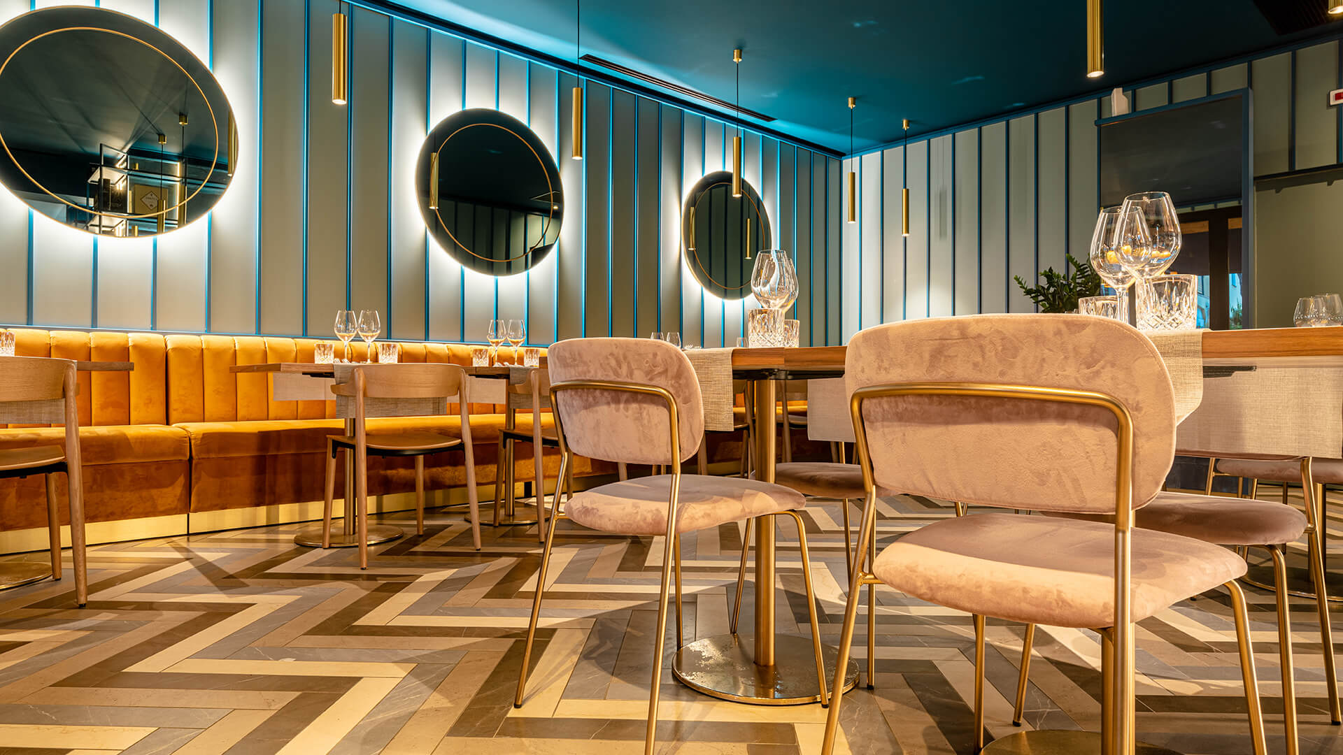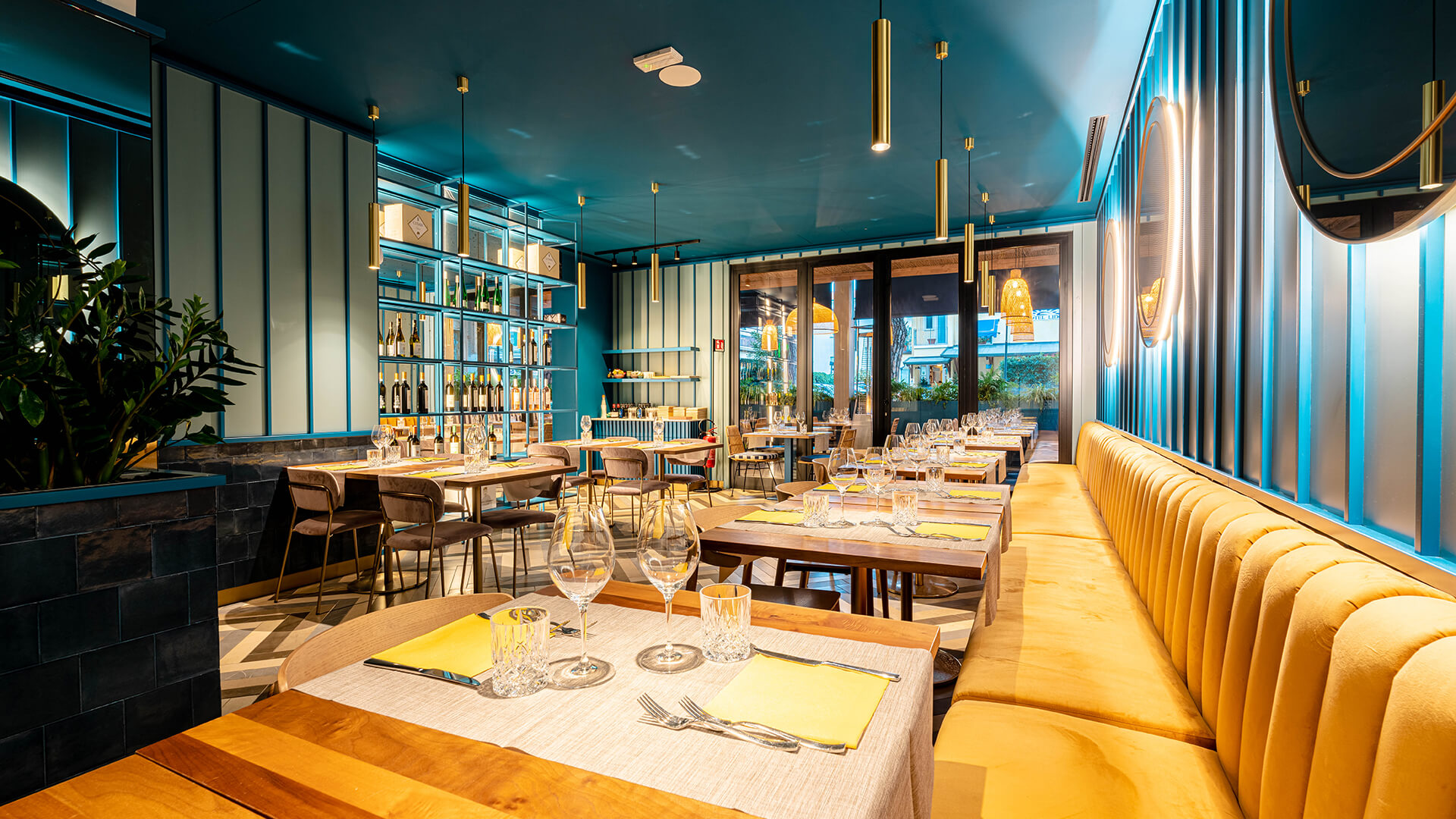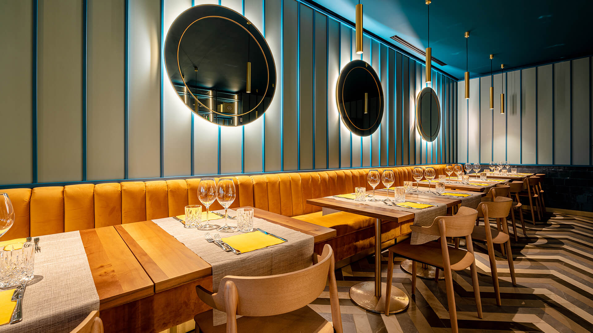 Divanetti gialli in velluto invitano al relax, mentre ripiani in metallo ospitano una ricercata selezione di bottiglie di vino. A soffitto, lampade tubolari dorate diffondono una luce soffusa, creando un’atmosfera di quiete e romanticismo. Specchi tondi, sapientemente disposti, amplificano lo spazio e riflettono la bellezza degli interni, donando un tocco di eleganza moderna.