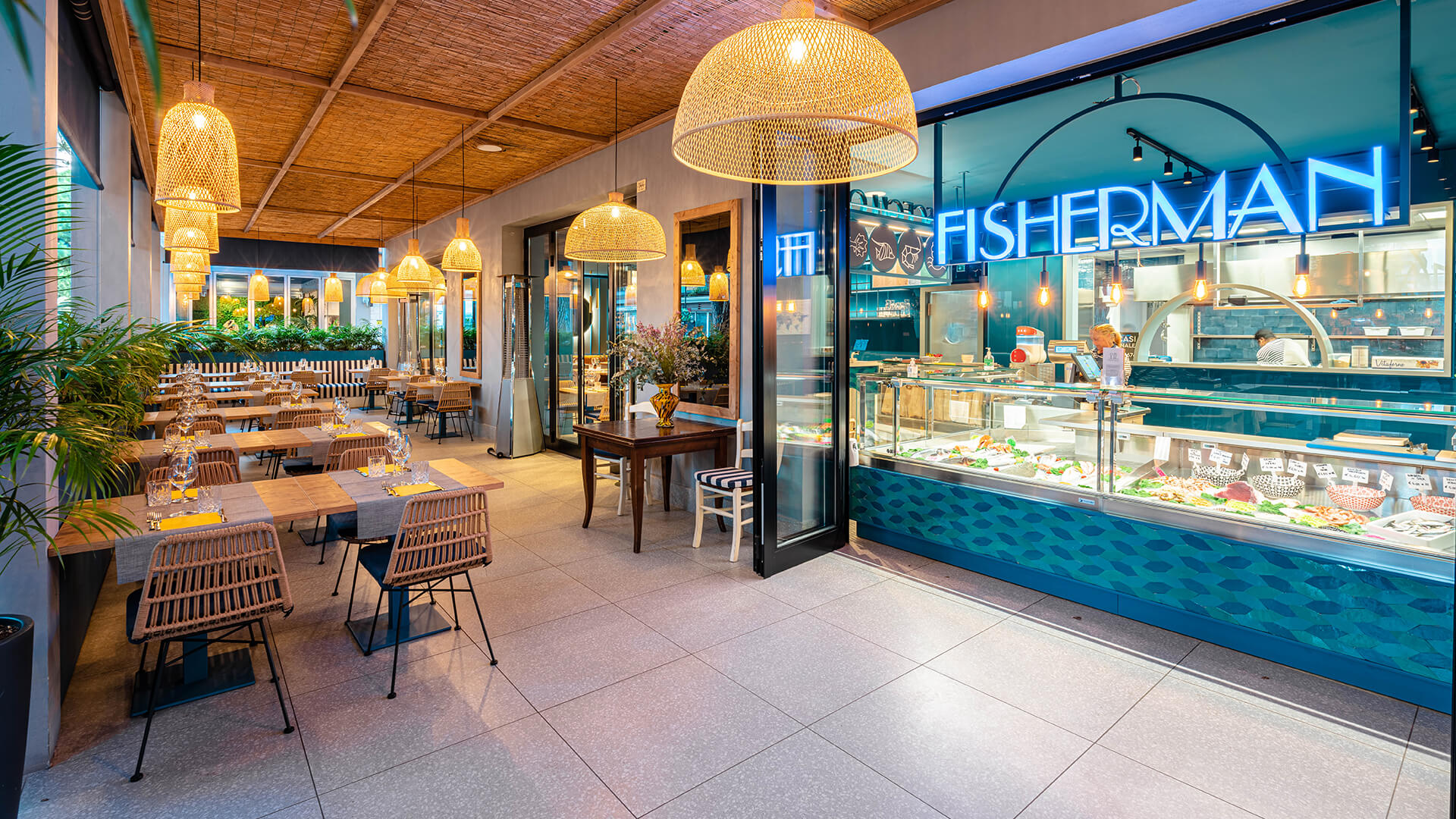 Un’armonia di contrasti accoglie gli avventori del Fisherman Jesolo: il ristorante si apre in un gioco di calde e fredde tonalità, dove il giallo e il beige si avvolgono al blu, creando un’atmosfera intima e suggestiva. Il pavimento, un elegante alternarsi di cotto e legno disposto a lisca di pesce, rimanda alle onde del mare, mentre i tavoli in legno massiccio e le sedie imbottite in velluto offrono un tocco di raffinatezza.