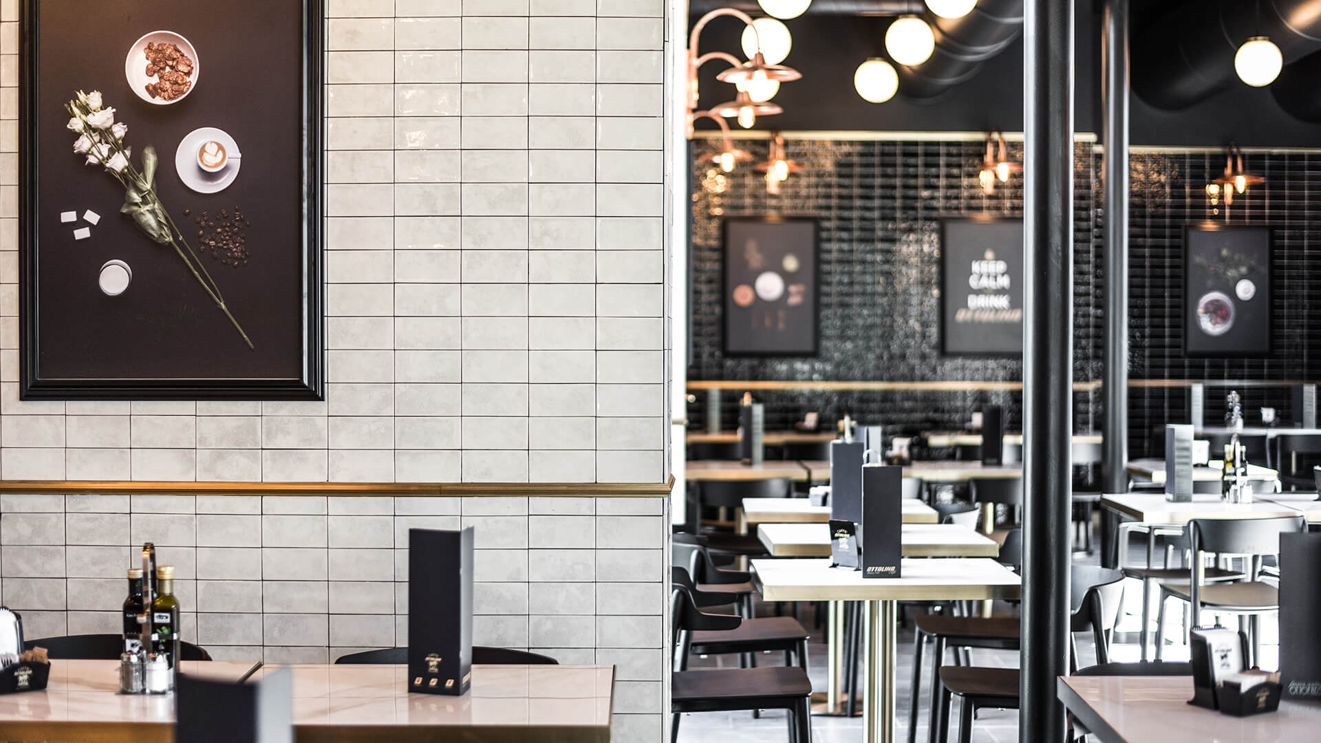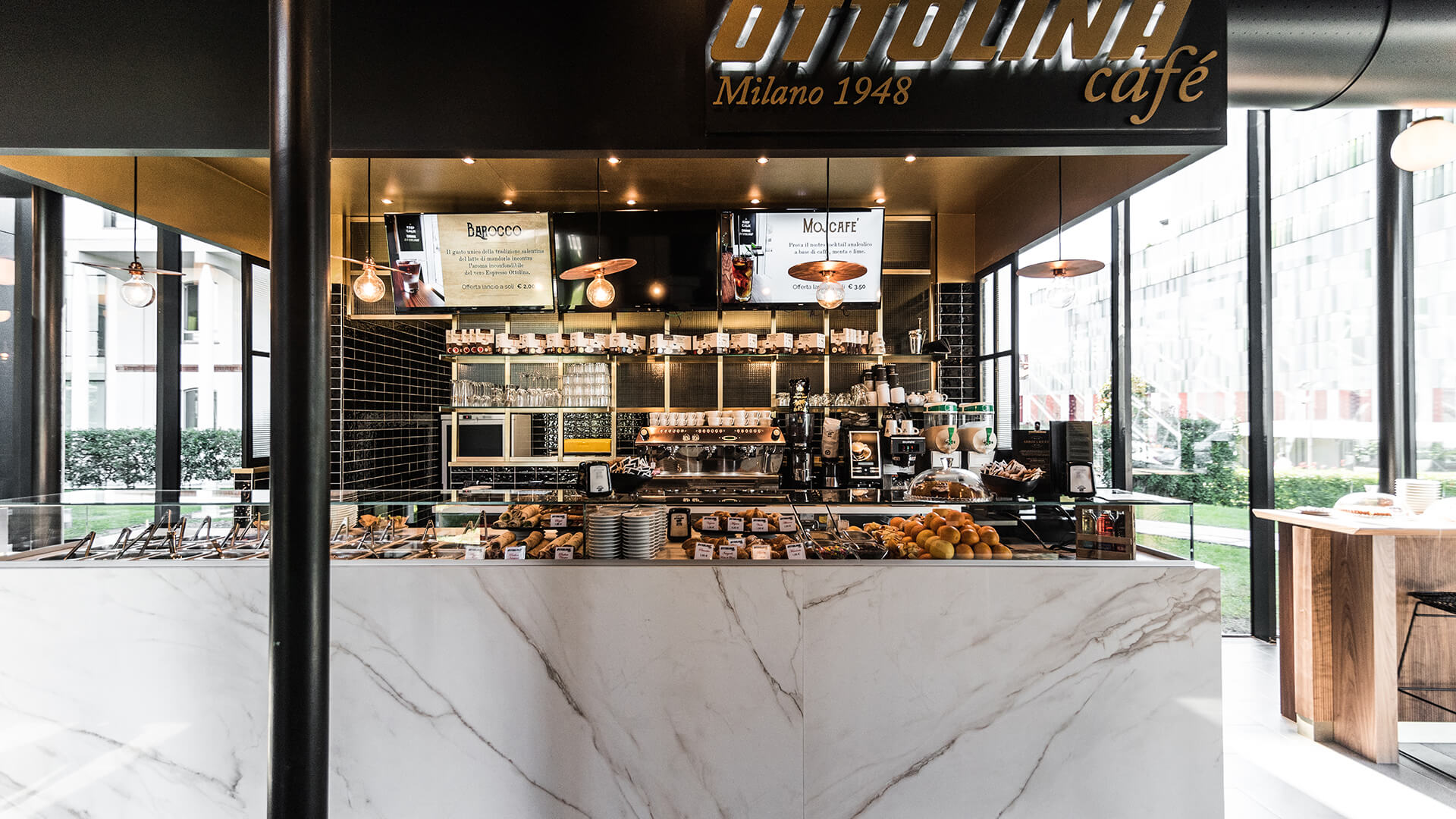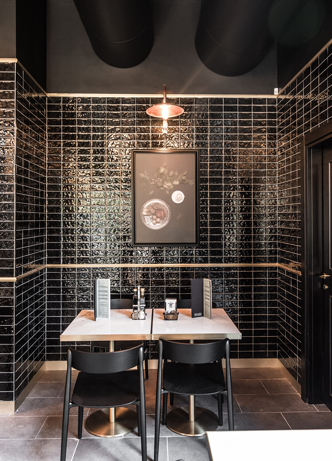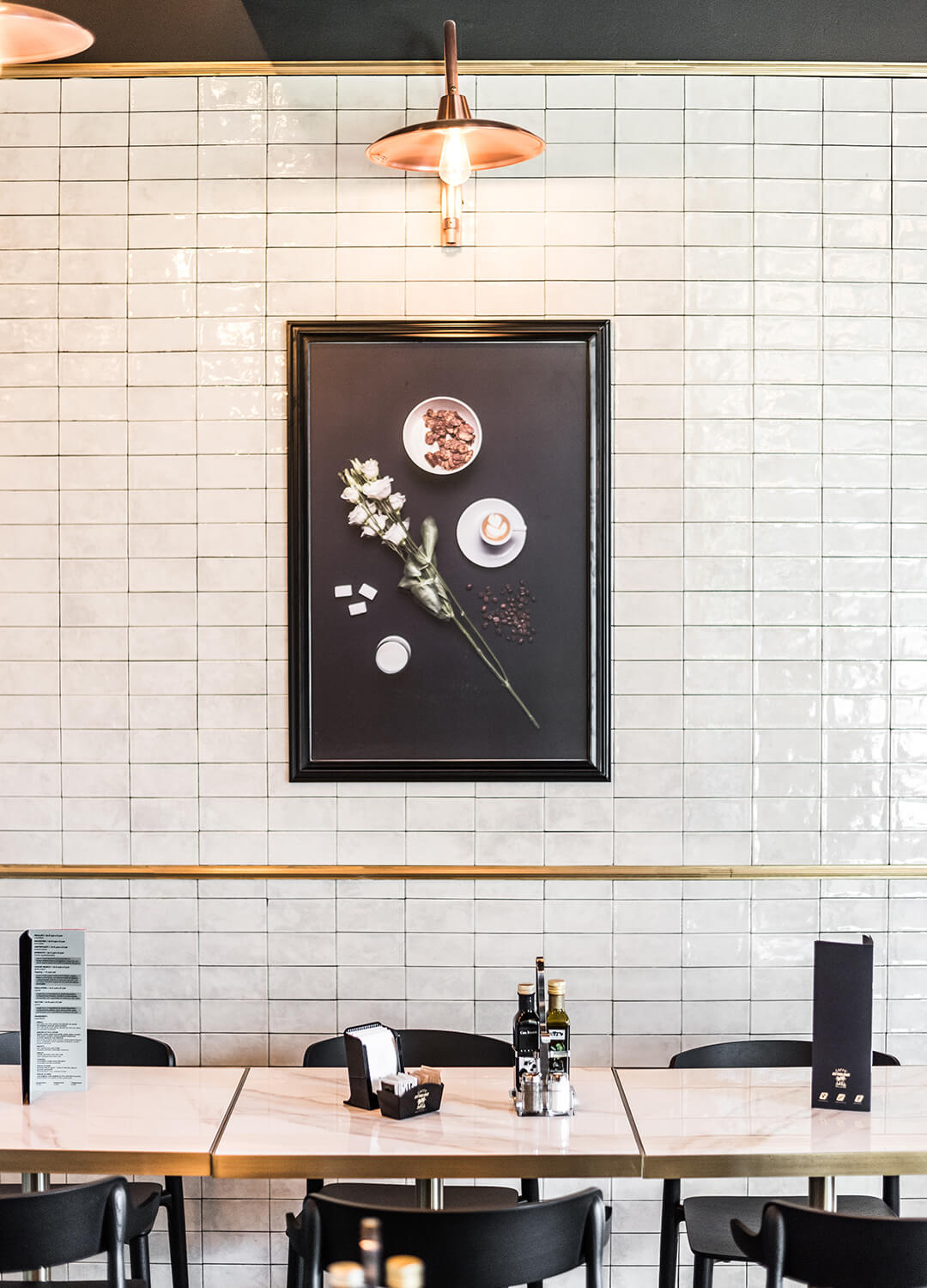 Il cuore pulsante del locale è il bancone in marmo bianco, un punto di riferimento dove ordinare e gustare un caffè o un pasto leggero. I tavoli, sempre in marmo bianco, si abbinano armoniosamente alle sedie in legno nero, offrendo un’esperienza di seduta confortevole e raffinata.