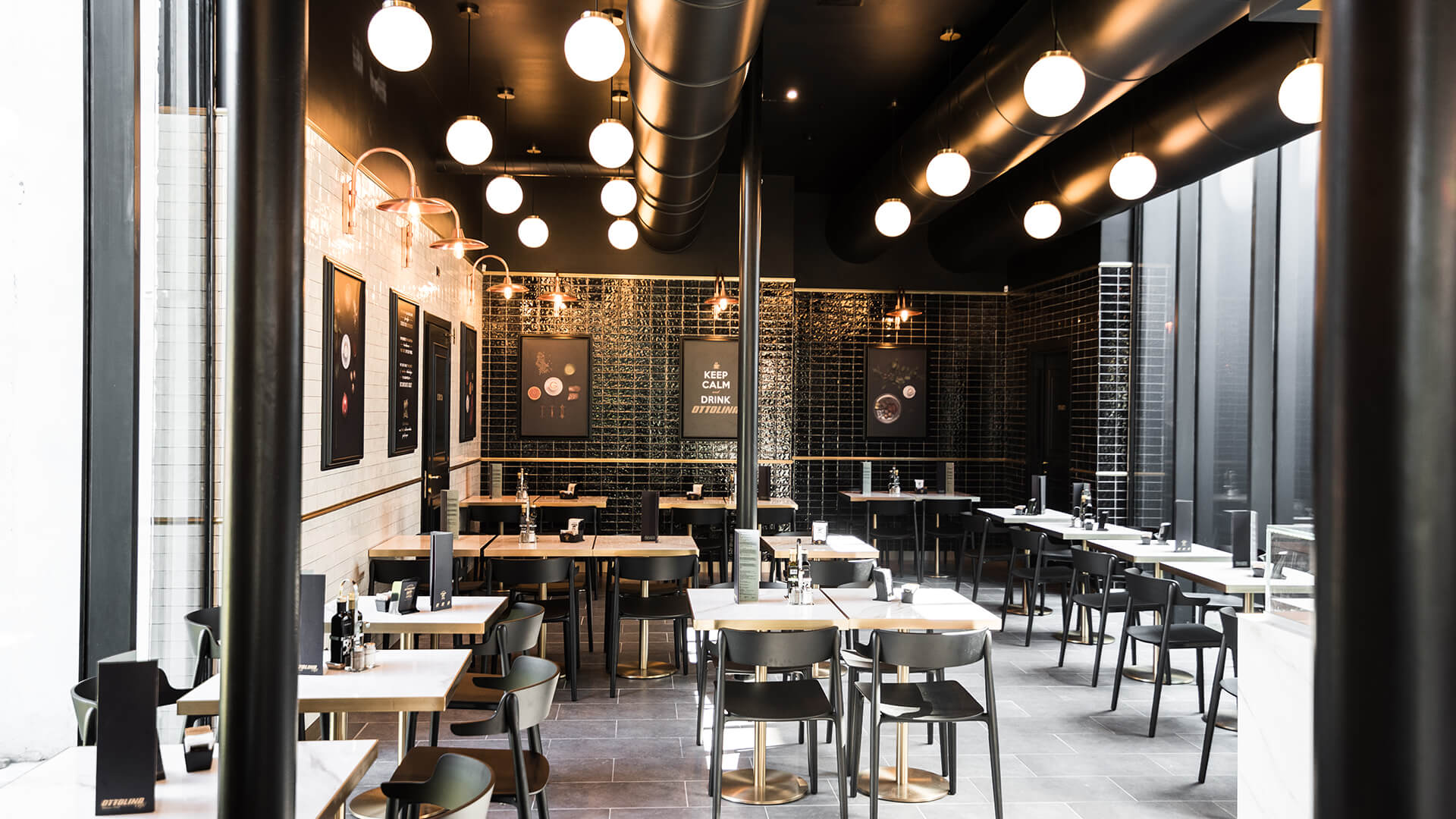 Varcata la soglia, vieni subito rapito da un gioco di contrasti cromatici che cattura l’attenzione. Il soffitto, completamente nero, ospita un impianto di condizionamento a vista che si integra perfettamente con il look total black, creando un’allure di sofisticata modernità.